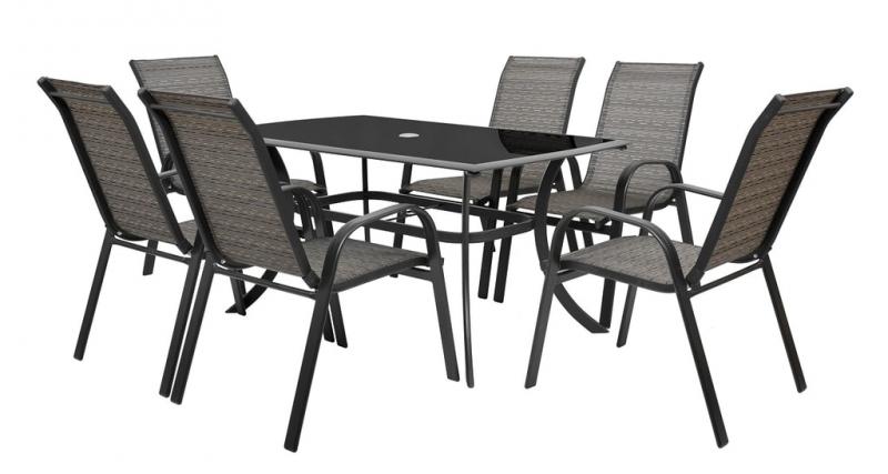 Komplektis 6 tooli ja laud. Kuus virnastavat tooli ja karastatud musta klaasiga alumiiniumprofiilidest laud. Sobib välis- ja siseruumides. Sobib kasutamiseks niiskes keskkonnas. Tooli kandevõime 120kg.